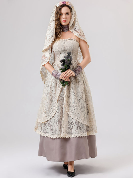 Beige 1930s Halloween Vampire Bride Lace Dress Set