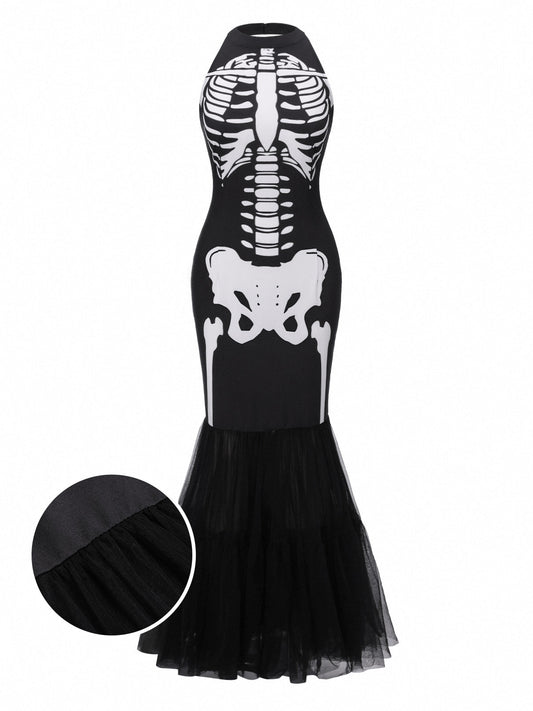 [Pre-Sale] Black & White 1930s Halter Skull Mesh Fishtail Dress