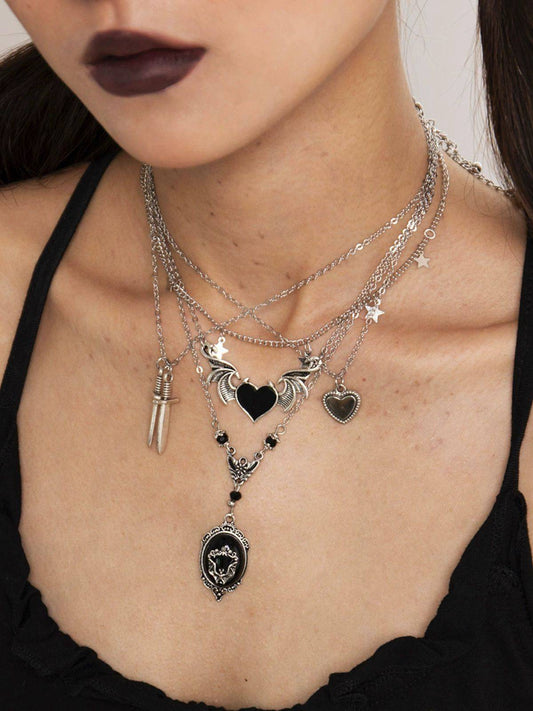 Black Gothic Heart Wings Star Dagger Pendant Necklace Set
