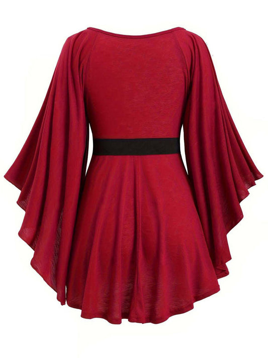 [Plus Size] Deep Red 1970s Batwing Sleeve Ruffled Top