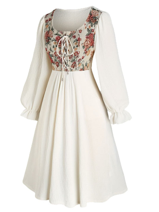 [Plus Size] Beige 1940s Floral Ruffle Sleeve Patchwork Dress