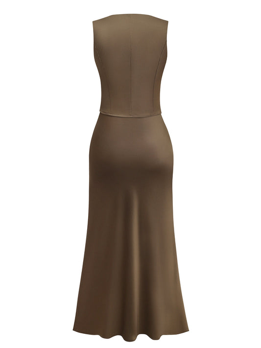 2PCS Brown 1930s Solid Satin Sleeveless V-Neck Vest & Fishtail Skirt