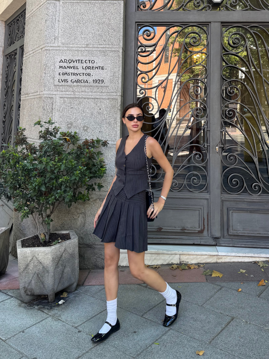 2PCS Dark Gray 1960s Pinstripes Top & Pleated Skirt
