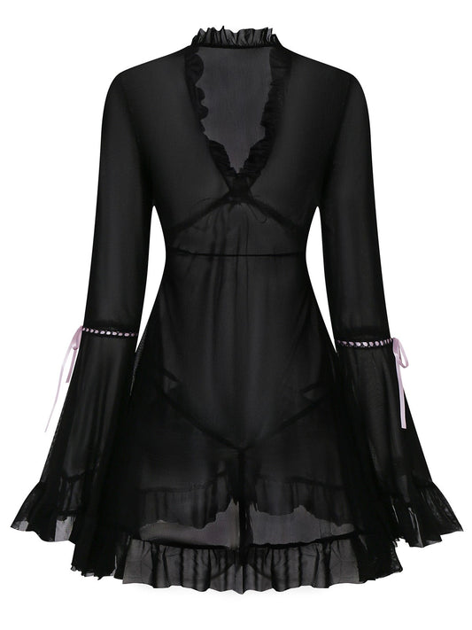 Black 1970s Bowknot Ruffled Sheer Nightdress