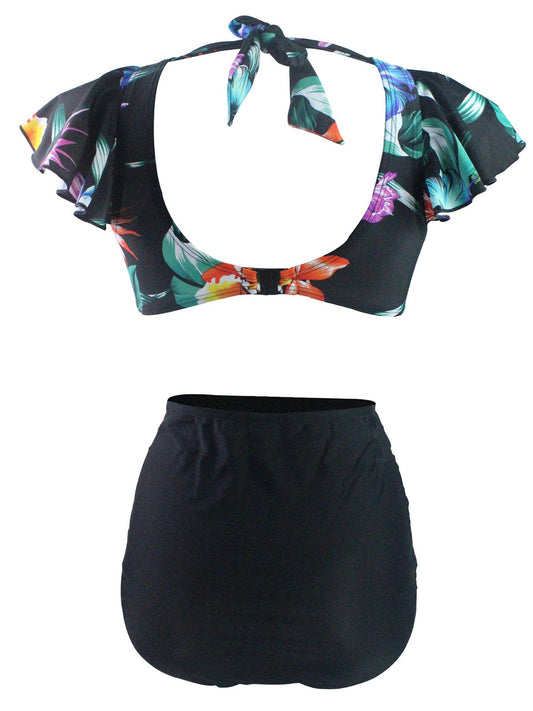 [US Warehouse] Ruffle Sleeve Floral Lace Up Bikini