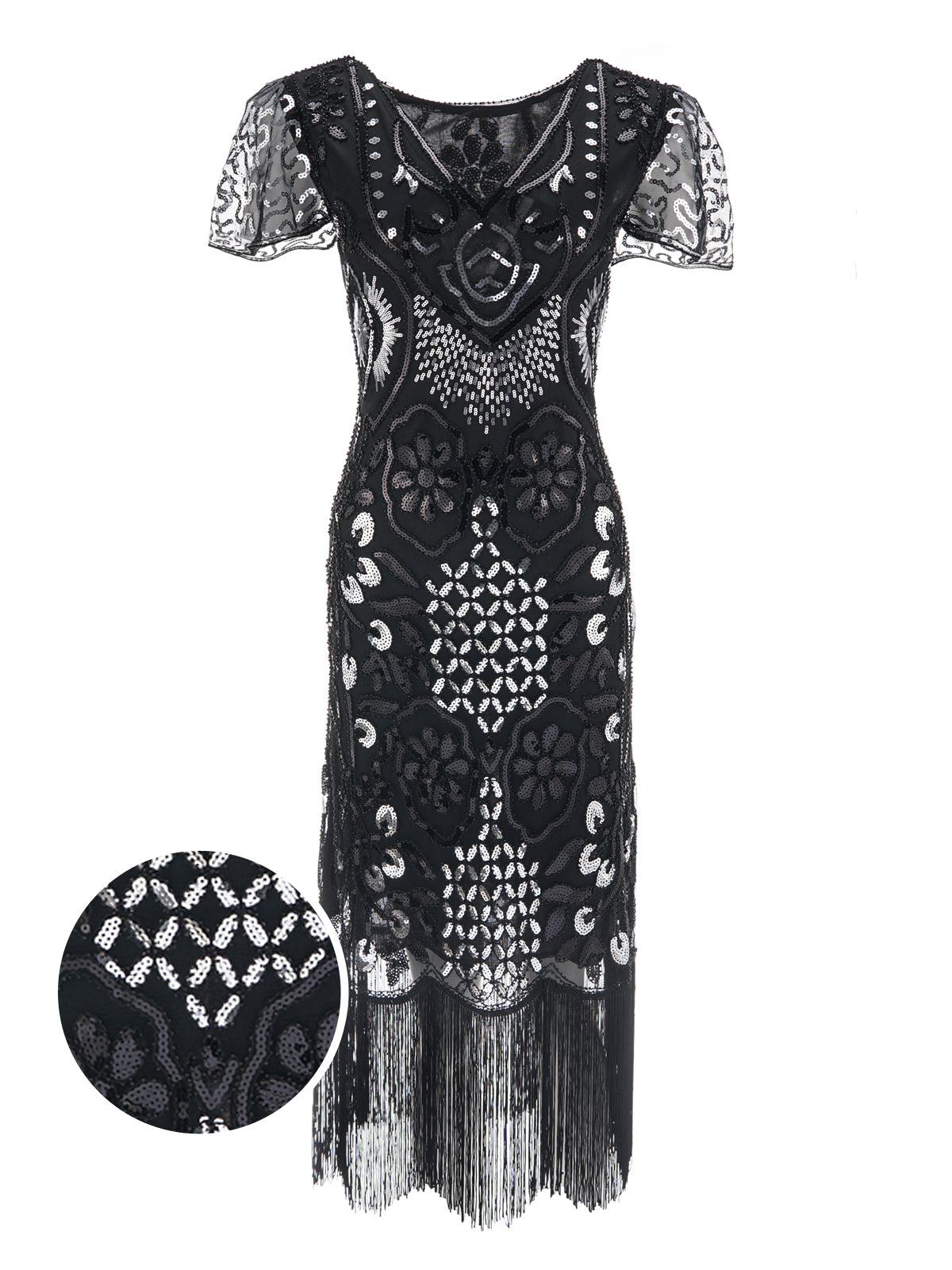 Let us know when you’ve popped your eyes back in! Thanks to swirling sequin patterns, it sparkles and shines all night long. Plus, the sultry v-neck and short sleeve make it even more alluring. Shimmer into an eye-catching vintage style with this iconic flapper dress from Retro Stage with crisp beading for a striking silhouette.
