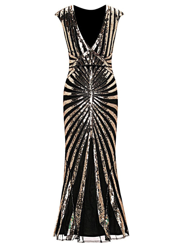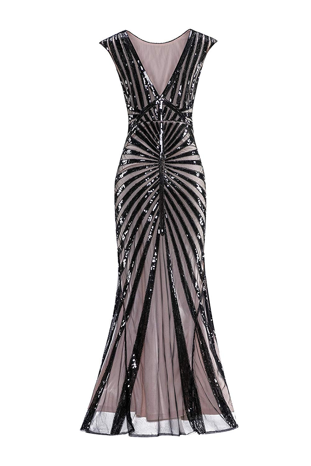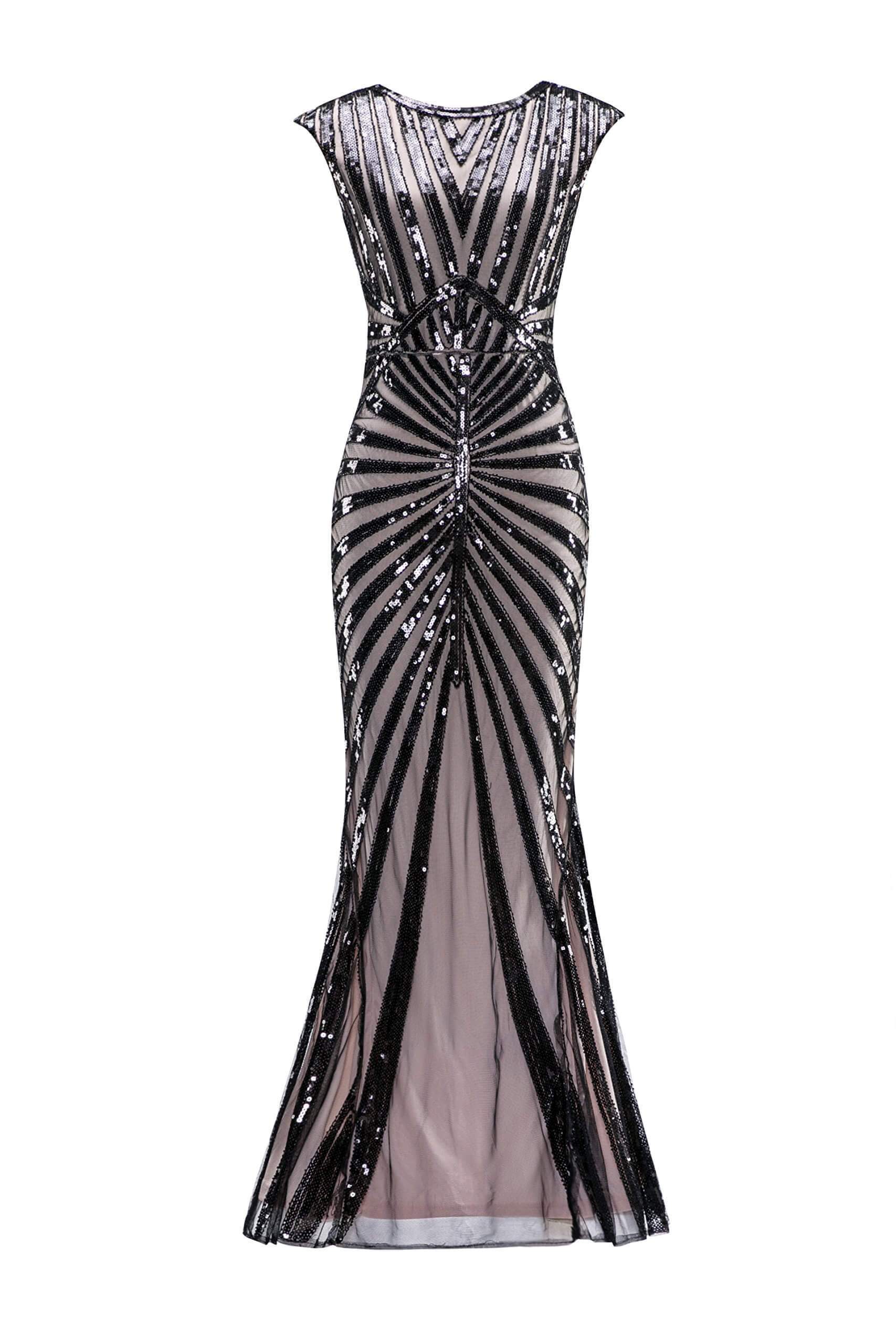 Your ticket to divinity, darlings! It’s all about the details with this stunning 1920s sequin gatsby dress from Retro Stage. Thanks to swirling sequin patterns, it sparkles and shines all night long. Plus, the sultry boat neckline and little cute cape sleeve make it even more alluring. The glitzy Art Deco vibes and sultry silhouette will have your shimmying and swaying with confidence.