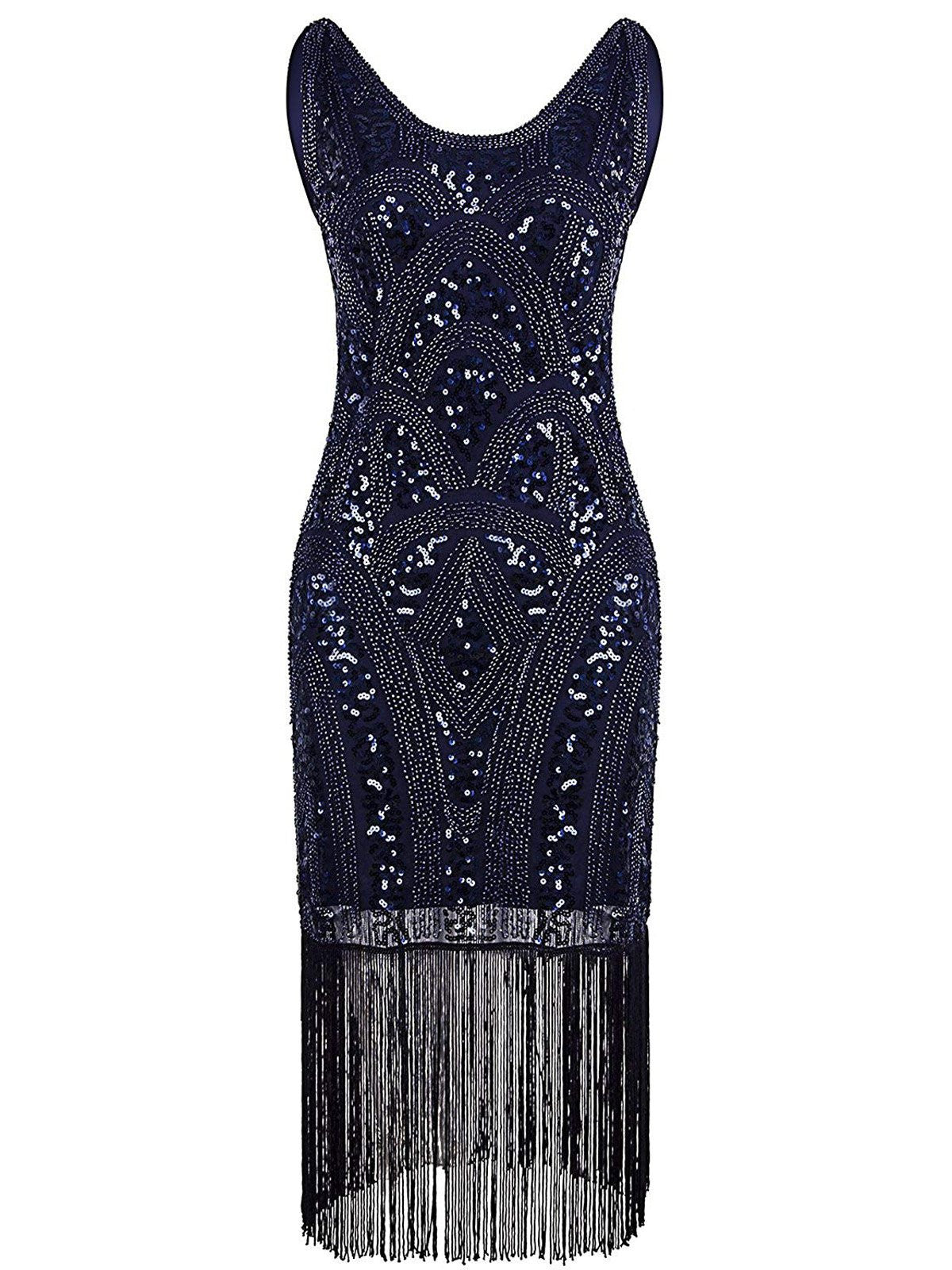 Shimmy some sparkle into your life, dear! A breathtaking vintage-inspired dress from Retro Stage. Conjuring the splendor of the bygone 1920s jazz era, this gorgeous flapper dress is styled with a gently elasticized round neck complete with sleeveless.