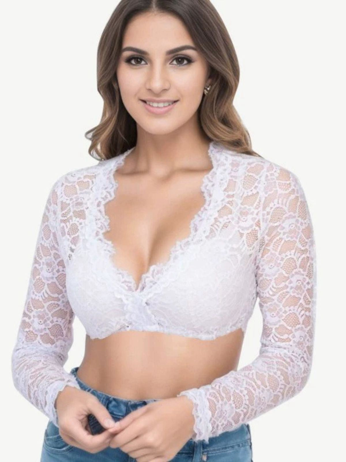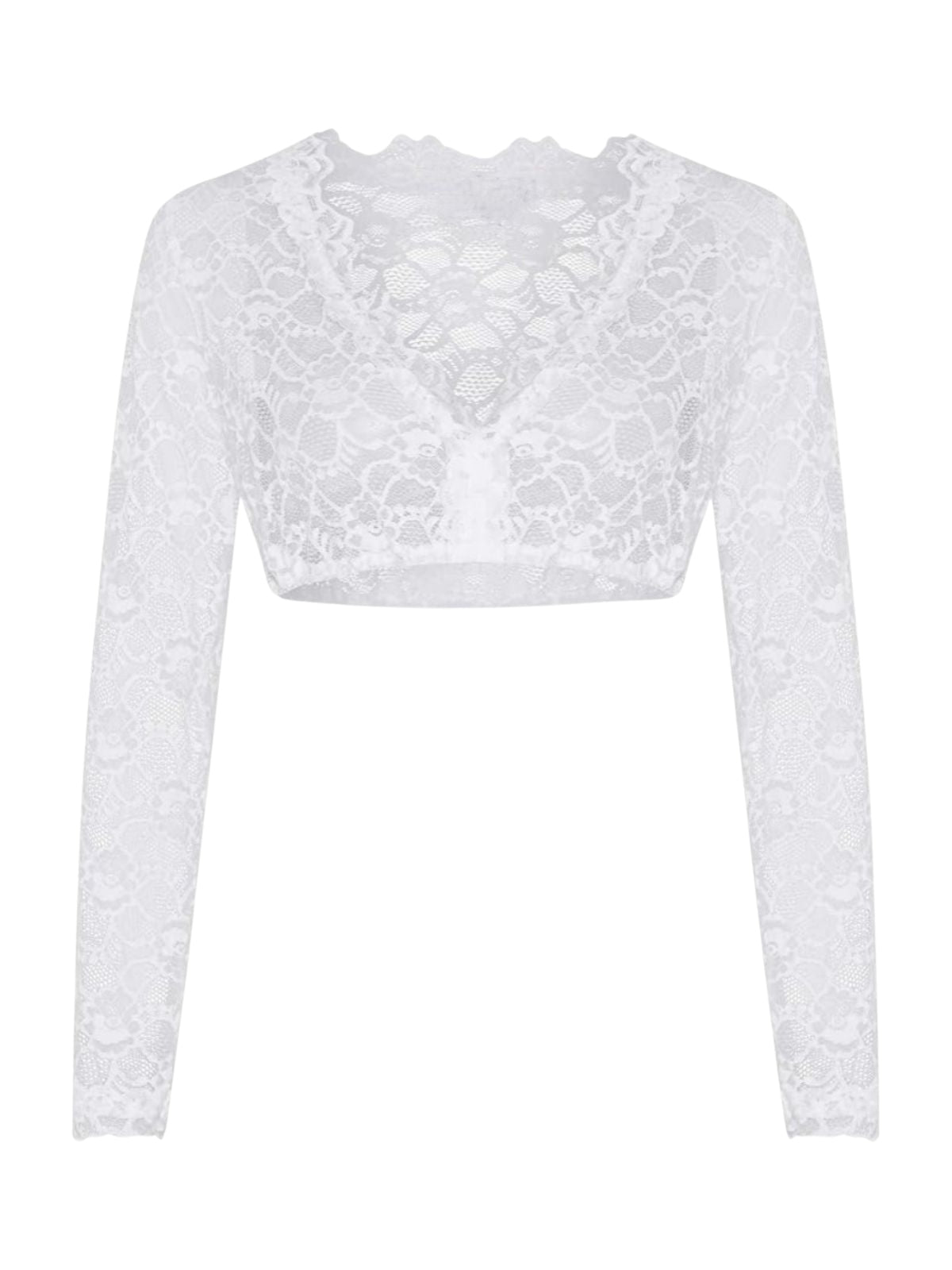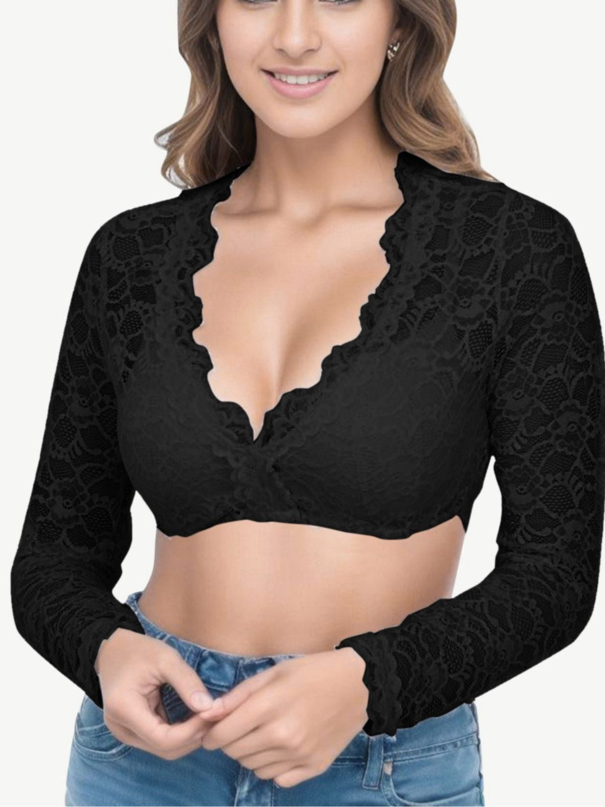 1950s Solid Lace Illusion Long-Sleeve Crop Top