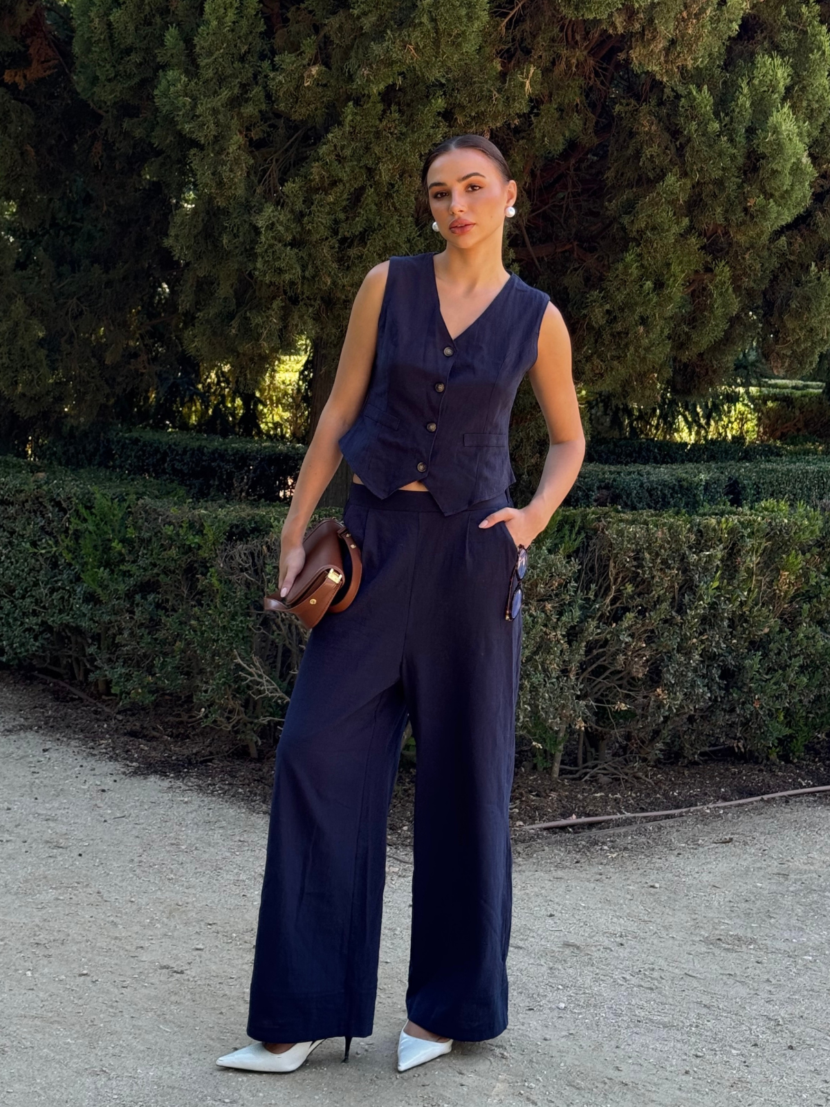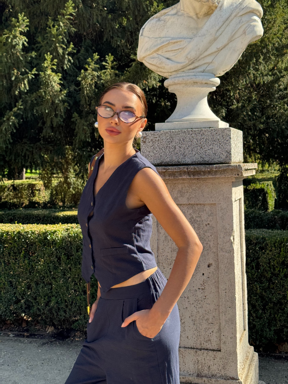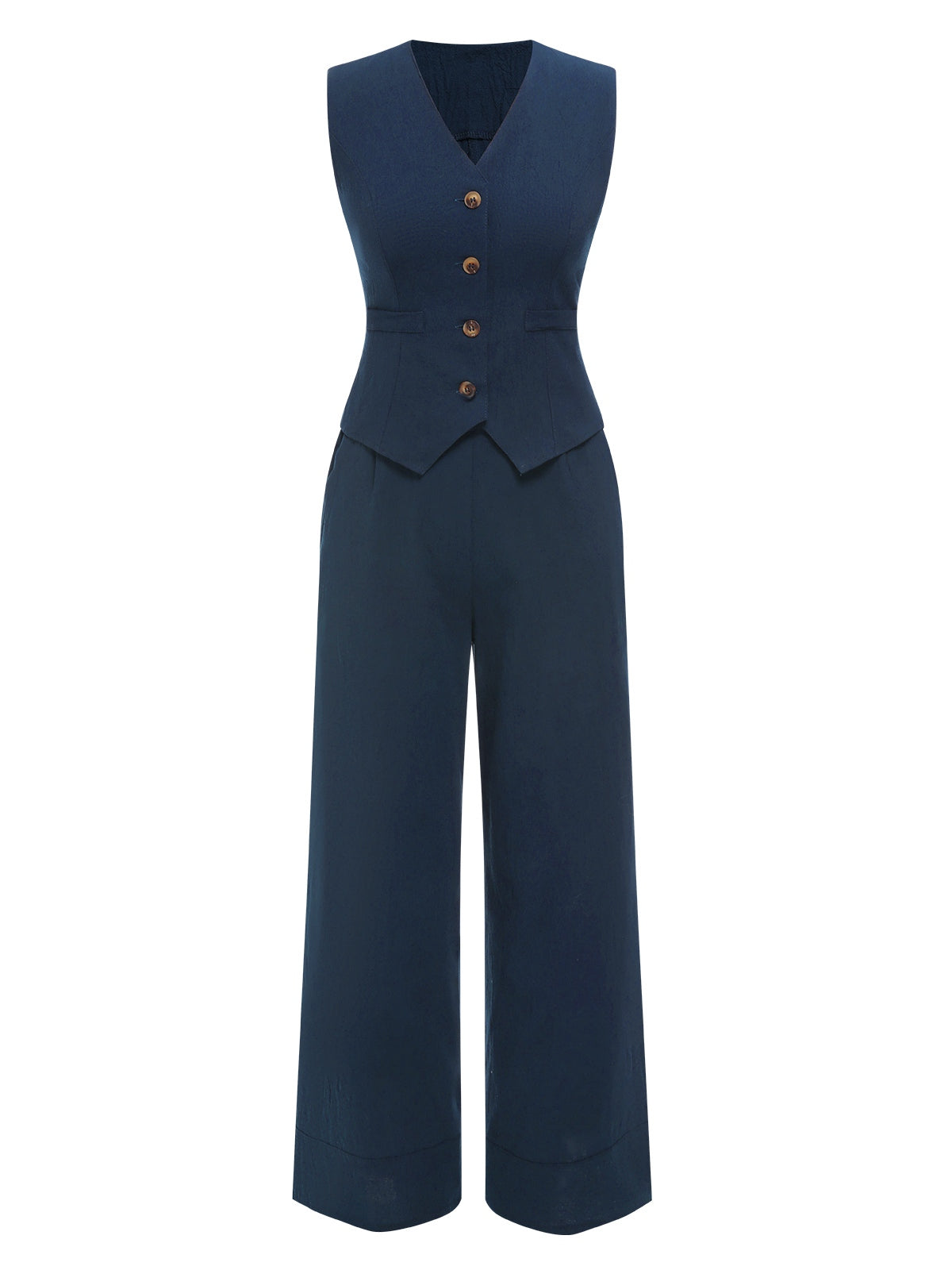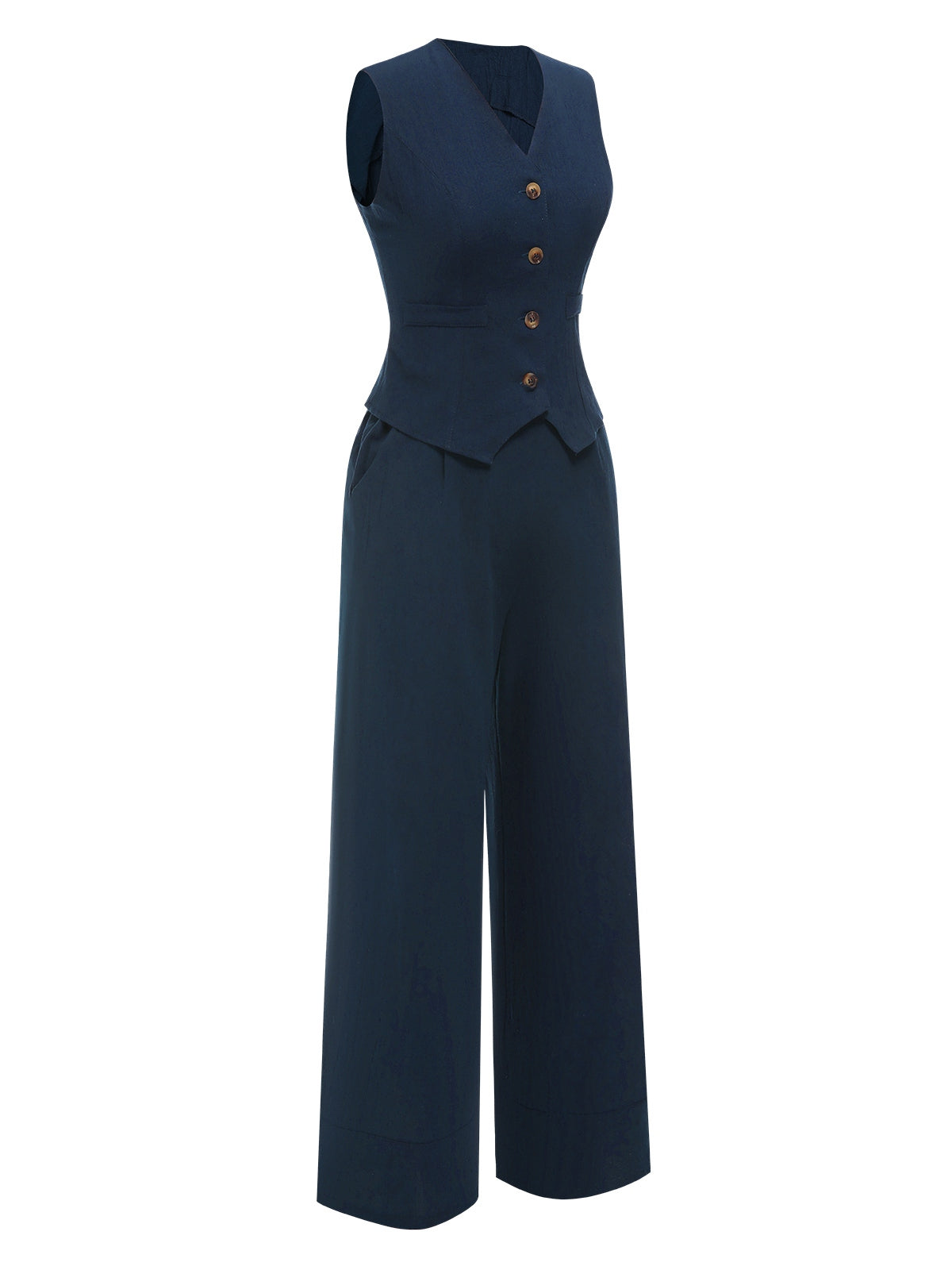 2PCS Dark Blue 1960s Solid Sleeveless Blazer Suit