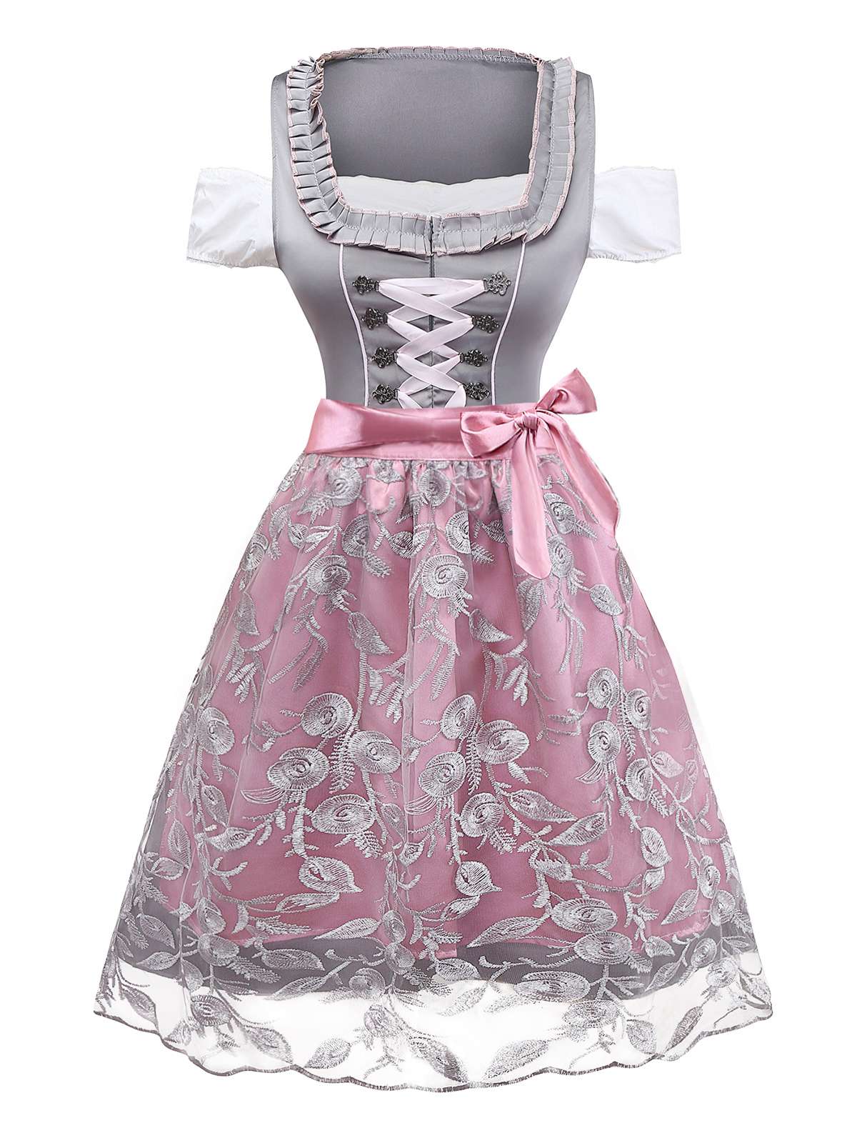 3PCS Pink 1950s Satin Lace Embroidered Dress & Off-Shoulder Top