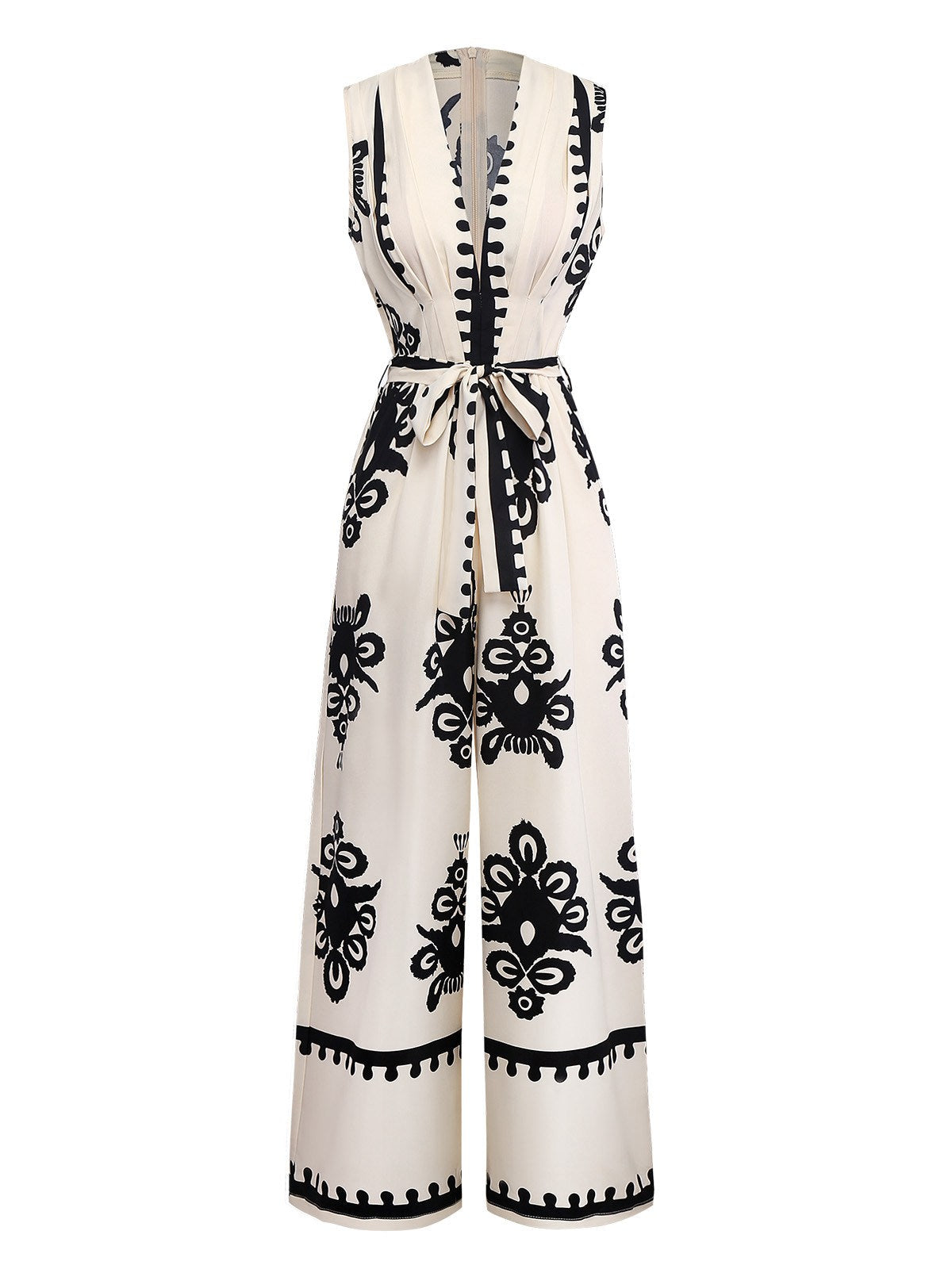 Beige 1970s Deep V-Neck Ethnic Print Jumpsuit