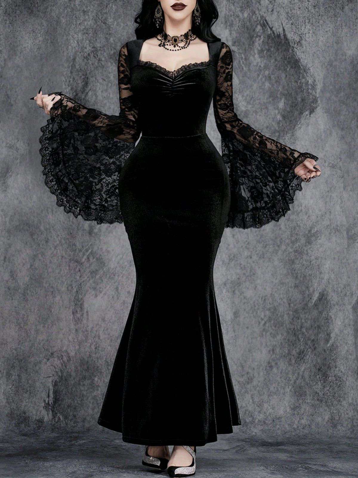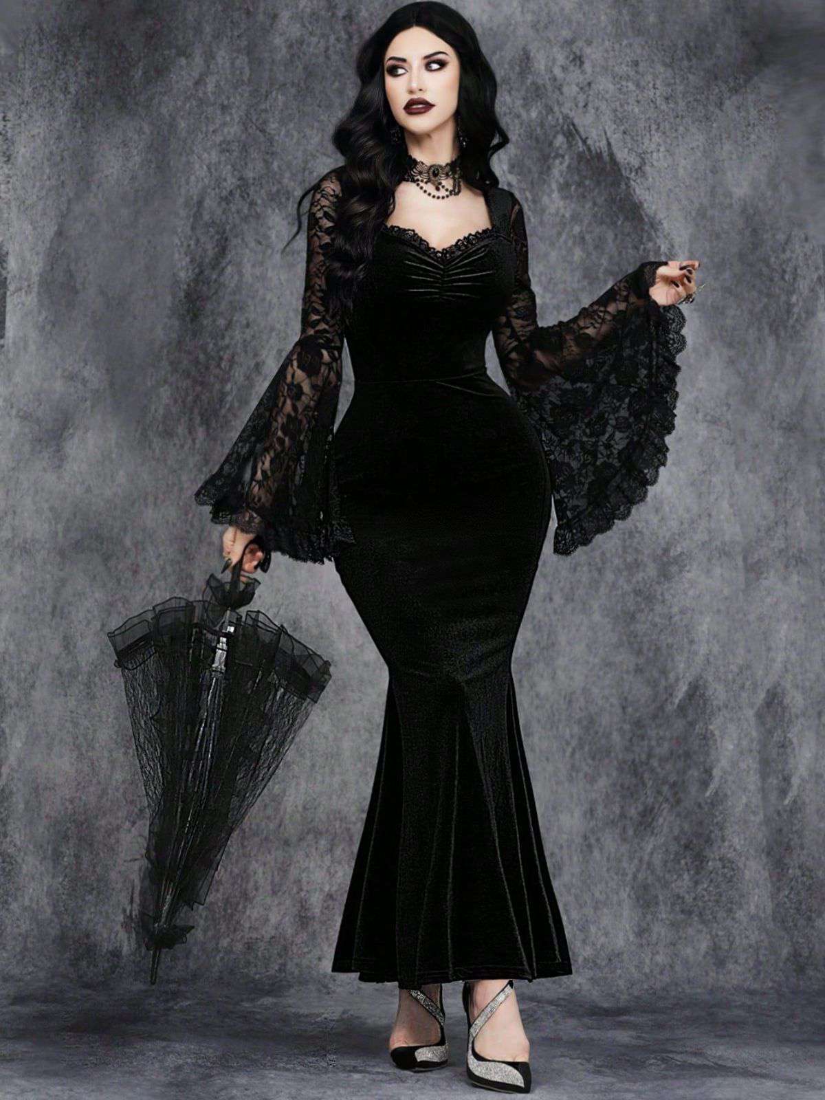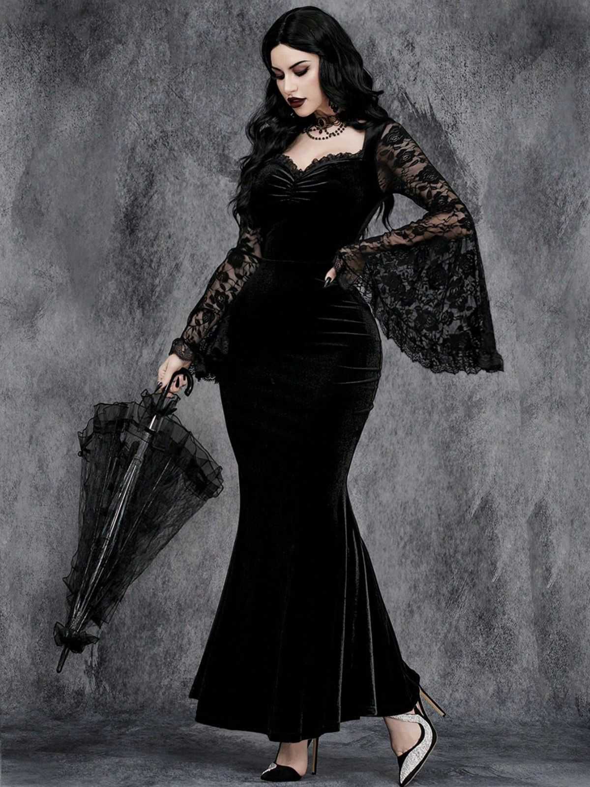 Black 1930s Lace Sleeve Velvet Fishtail Dress