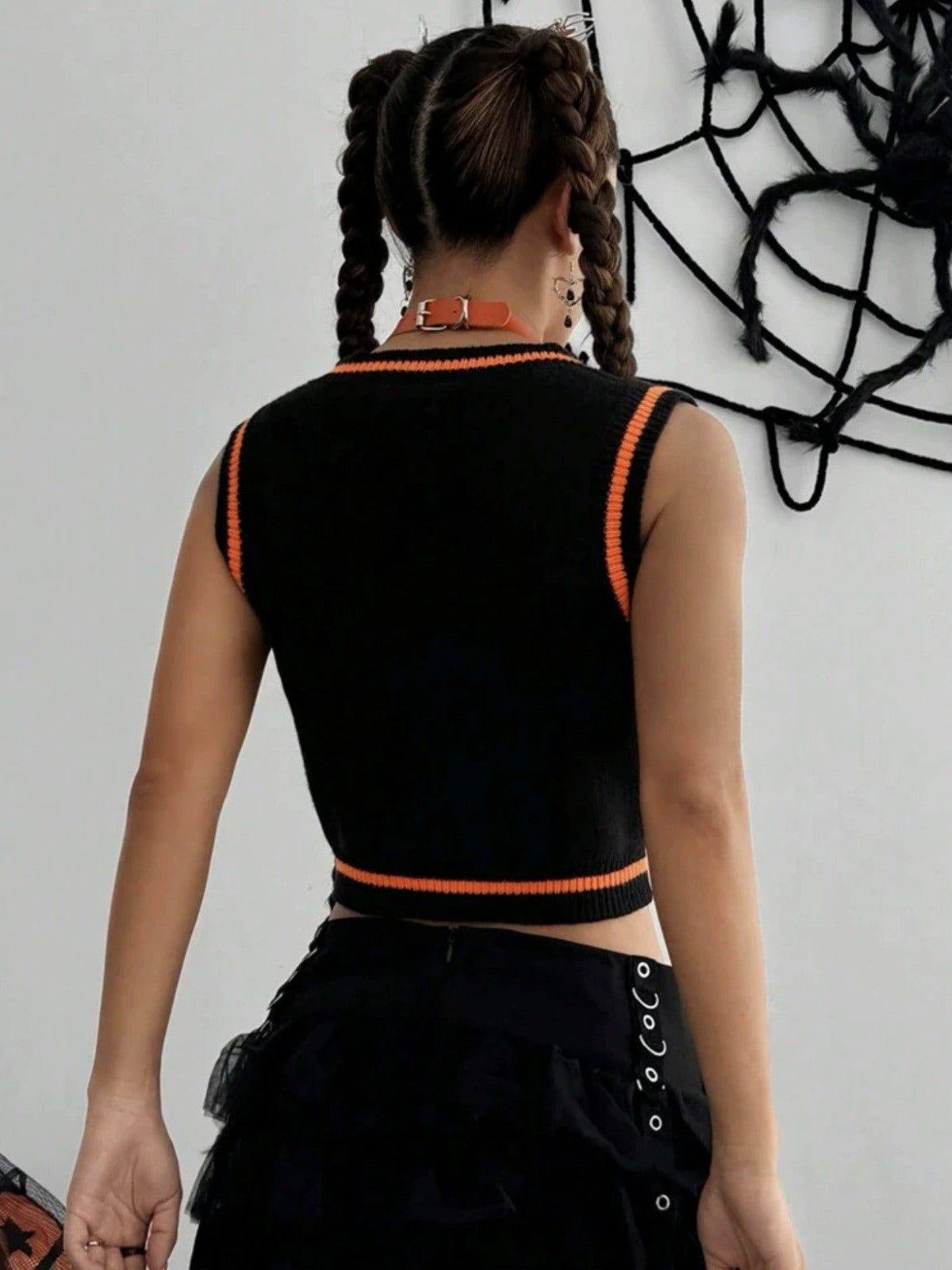 Black 1970s Halloween Pumpkin Face Sweater Vest