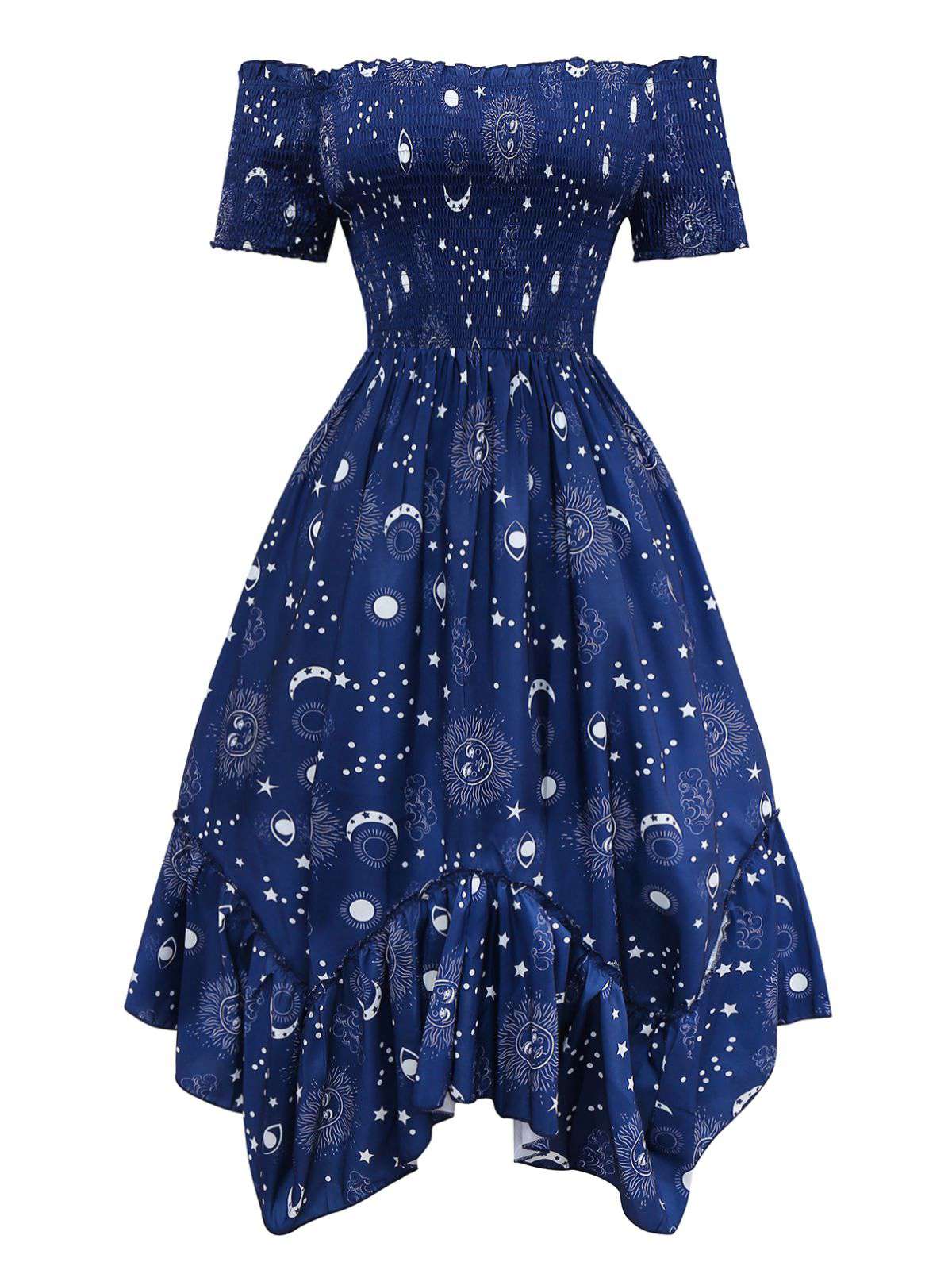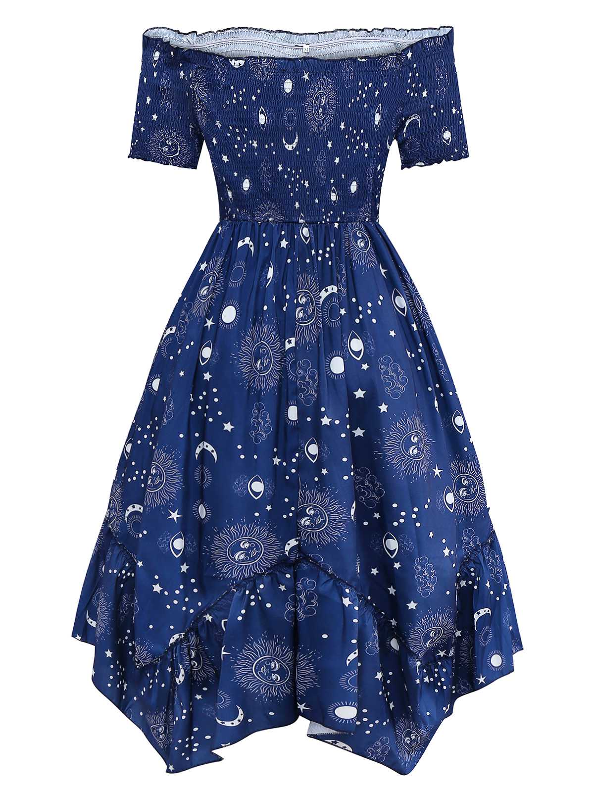 Blue 1950s Stars Moon Irregular Hem Off-Shoulder Dress