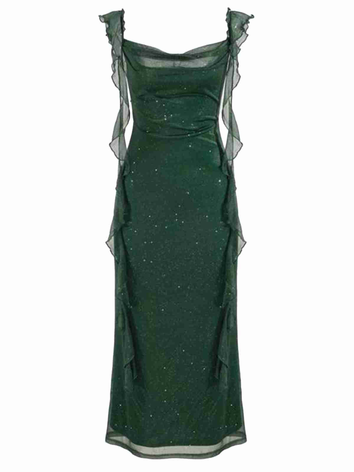 Green 1920s Sparkle Mesh Ruffle Backless Dress