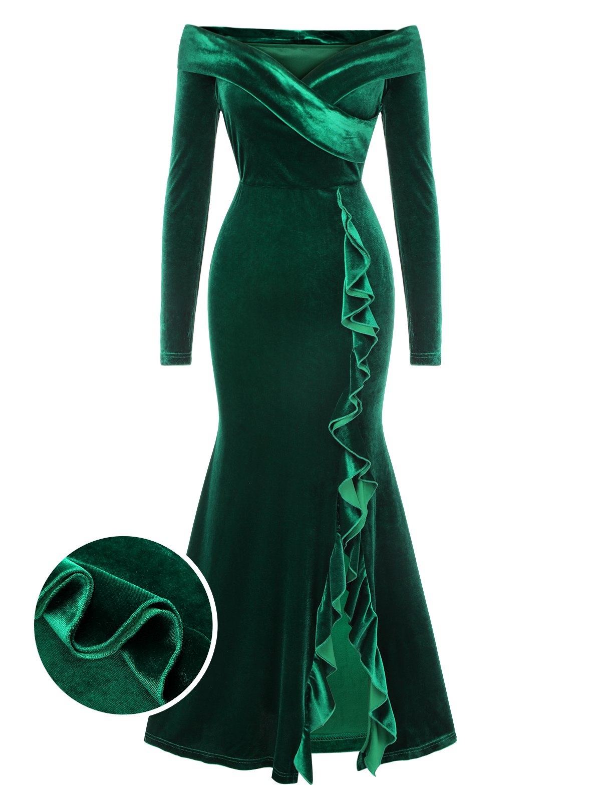Green 1930s Velvet Off-Shoulder Ruffle-Trim Mermaid Dress