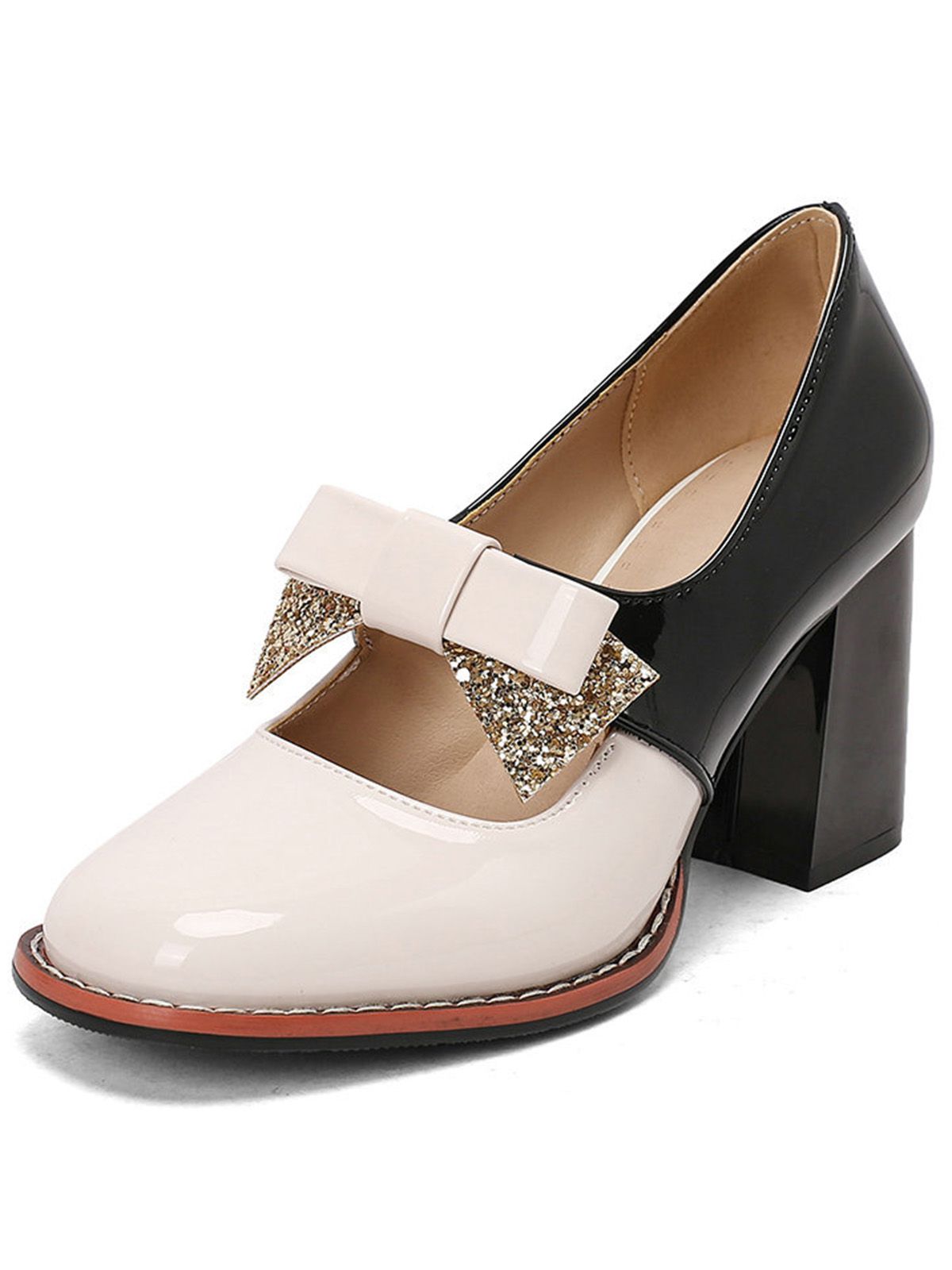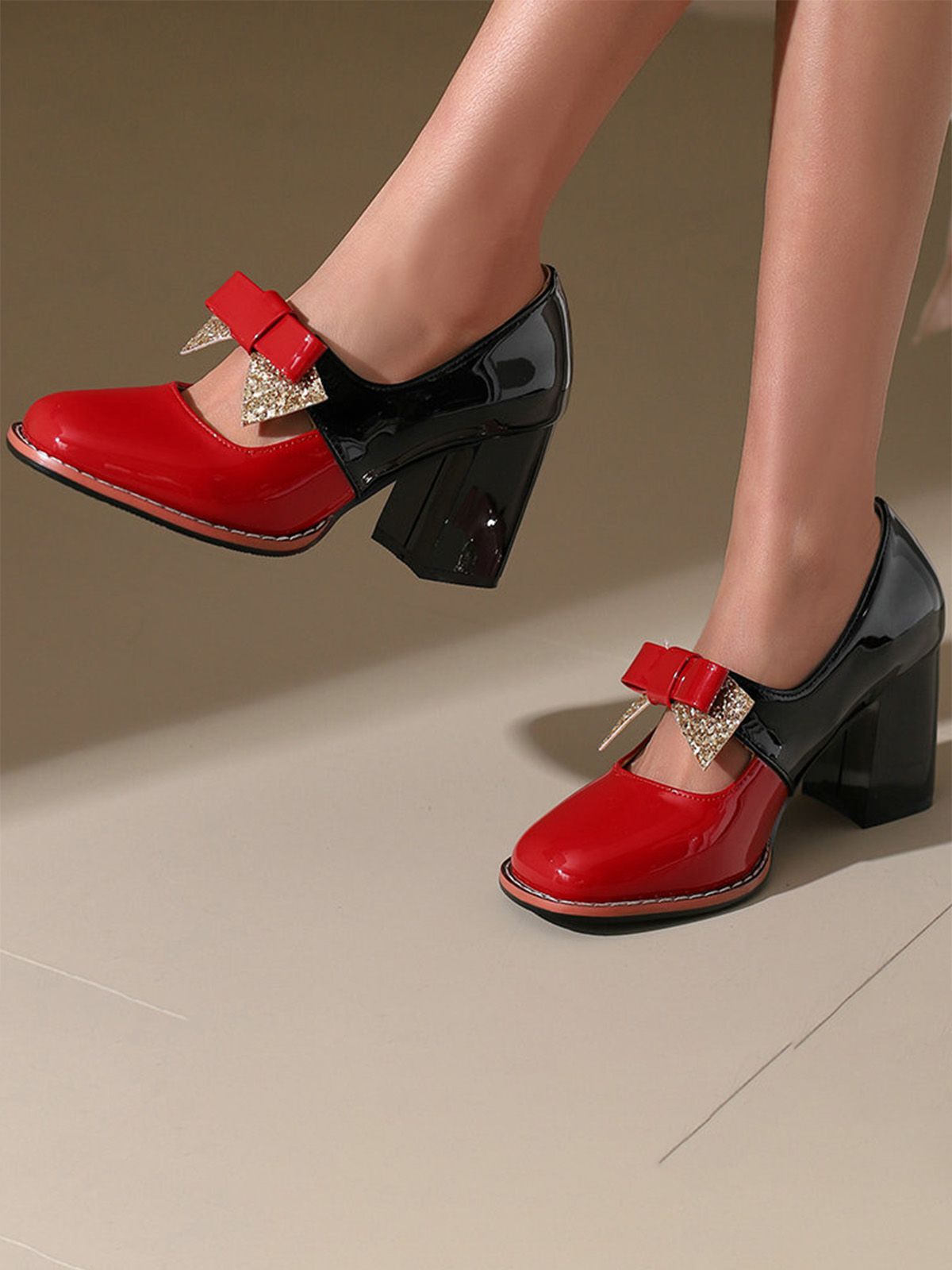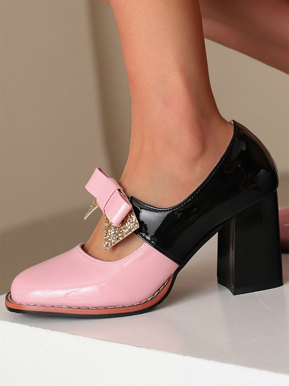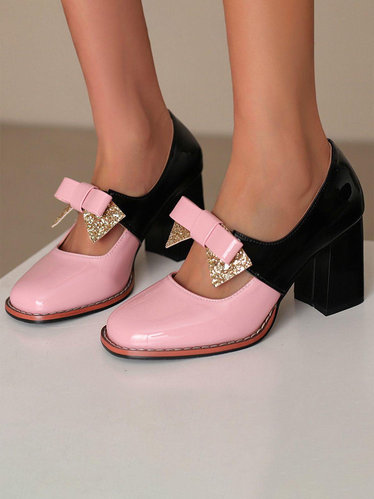 Mary Jane Colorblock Glitter Bowknot Chunky Heels