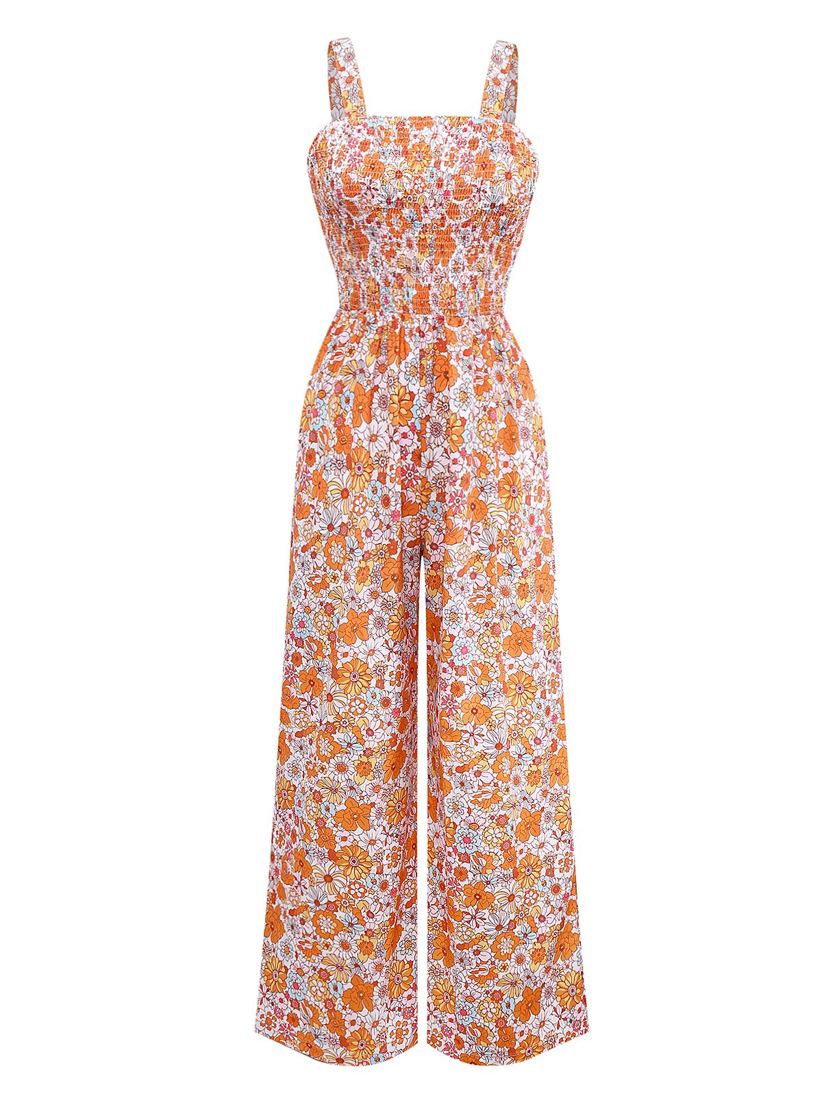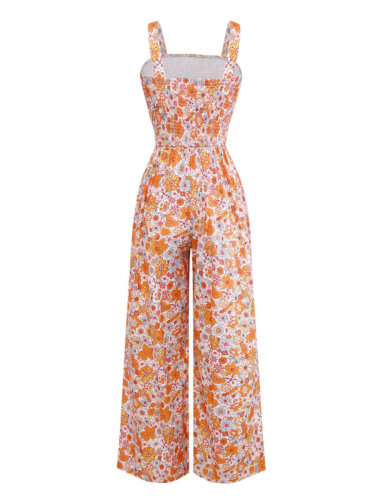 Orange 1970s Floral Print Wide Leg Jumpsuit