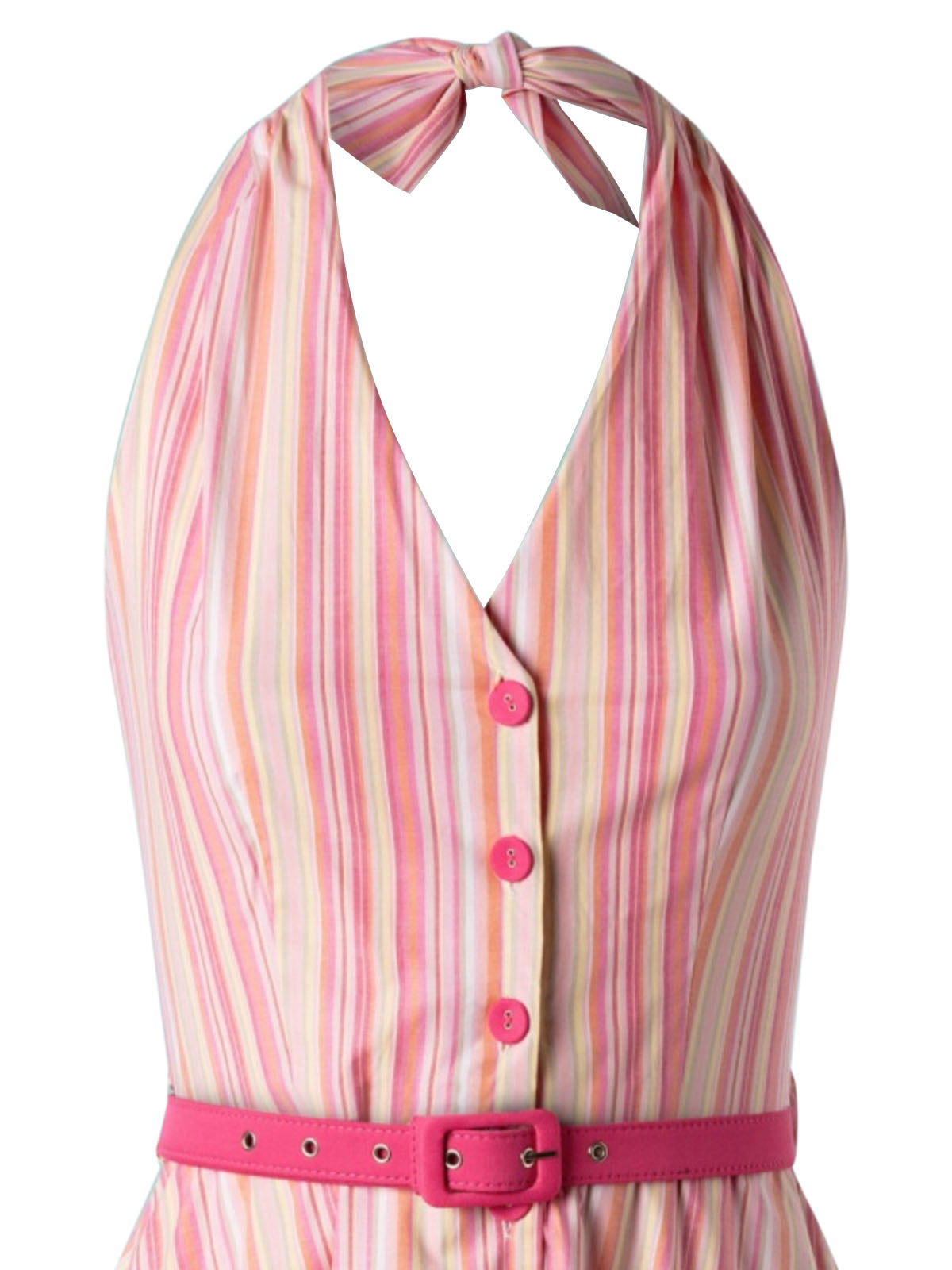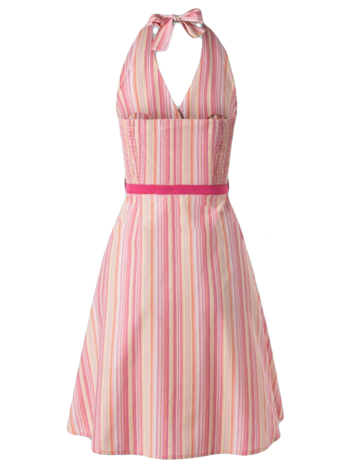 A sweet dress in fabulous 1950s vintage appeal fresh from Retro Stage. A gathered halter neck, trim and tailored natural waist create an elegant and darling silhouette. The back of the bodice features a shirring elastic panel that allows for a perfect, comfortable fit. While the wide shoulder straps afford ample cover for bra straps. With a dress this special, you just know that you‘re going to look a million dollars at your party, prom or tea party.