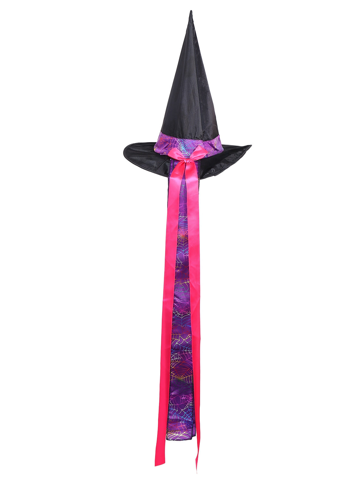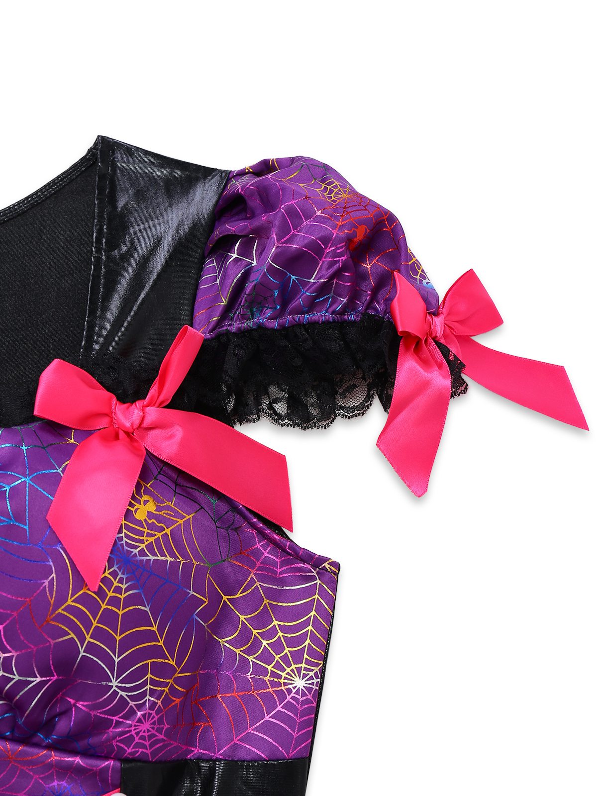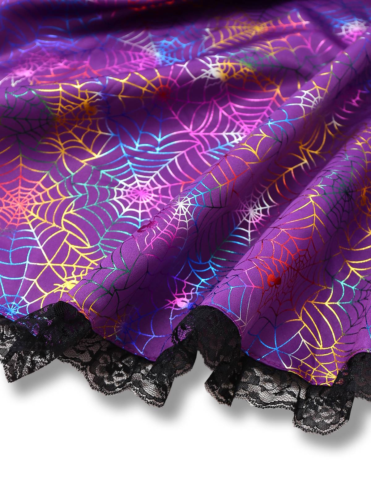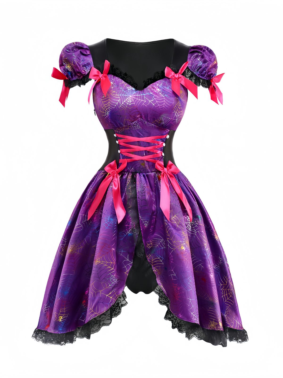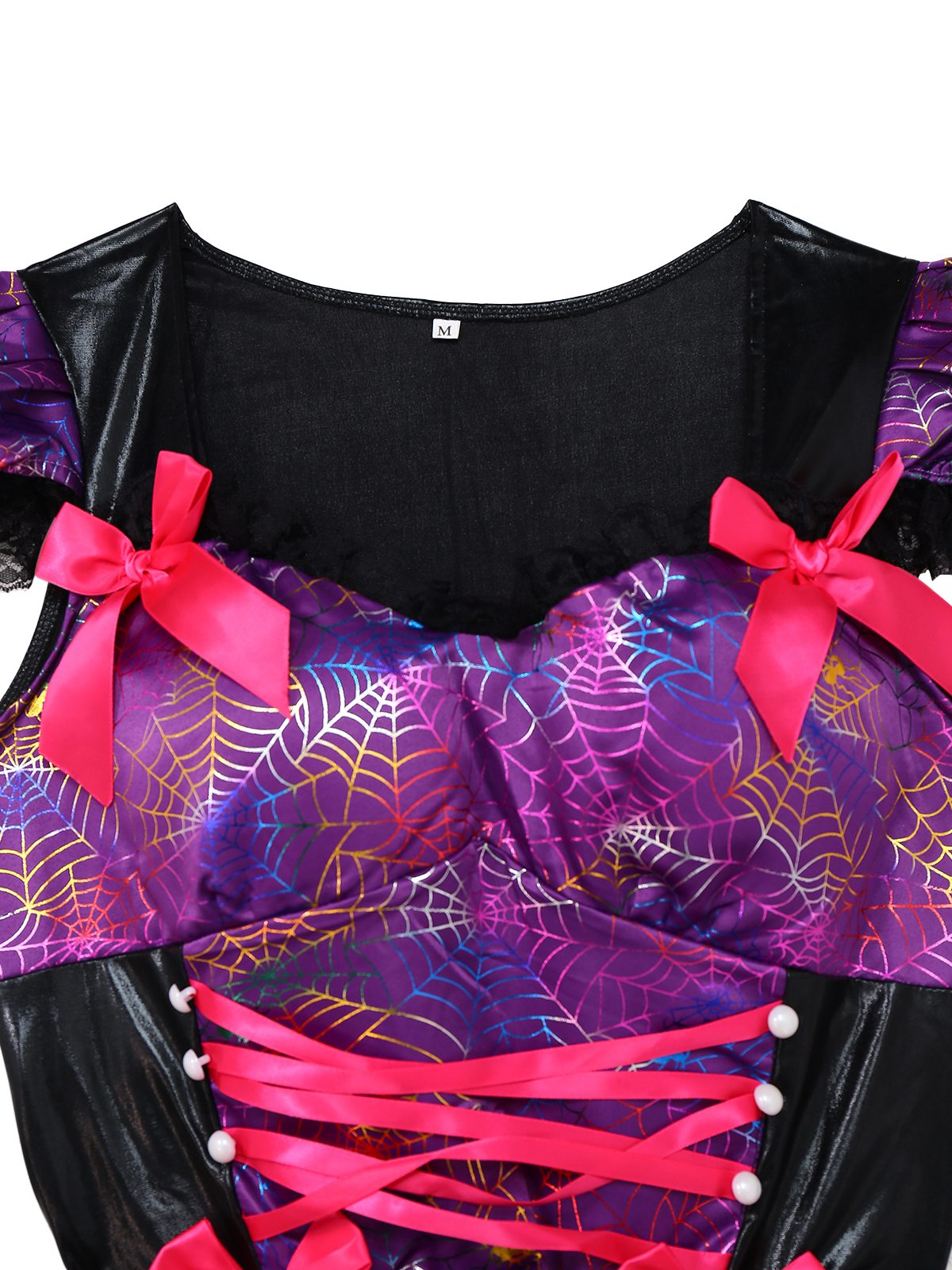 Purple 1970s Halloween Spider Web Witch Lace-Up Dress With Hat