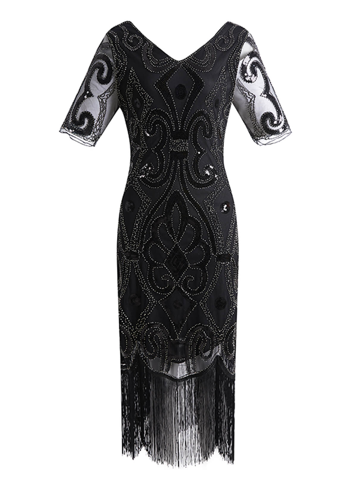 Shimmy some sparkle into your life, dear! Shimmer into an eye-catching vintage style with this iconic flapper dress from Retro Stage with crisp beading for a striking silhouette. Gleaming from every angle, the fitted form drops to a straight hemline that sways with a long black fringe.