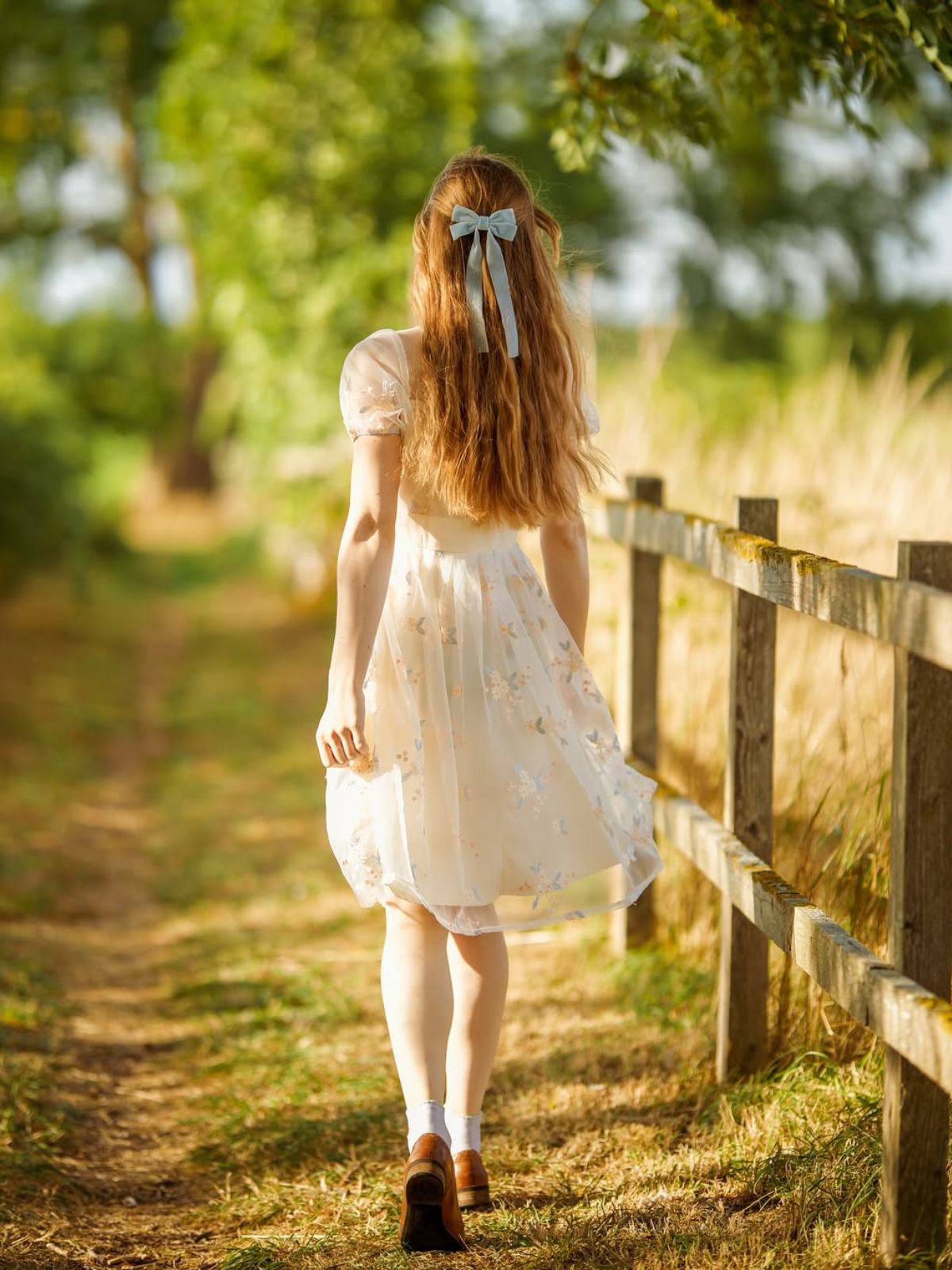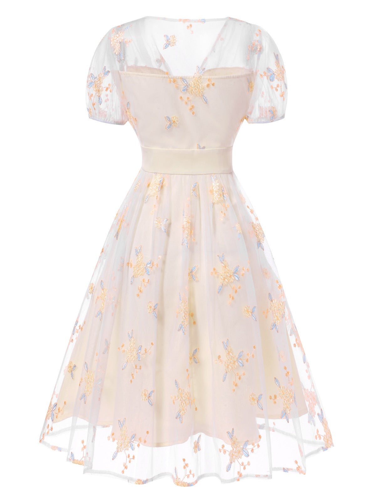 White 1950s Deep V-Neck Embroidered Floral Dress